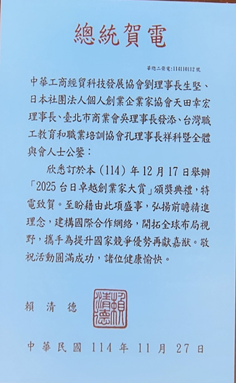這次台日創業家大賞共評選出5家台日友好貢獻獎、28 家中小企業、8位創業導師、13家新創企業、2家微型創業優選,其中,十方文化橫掃四項大獎、岳洋文化設計及悅澤生物科技也奪下三項獎項。妮芙露國際、人工智能、長川資訊及全能養生,也各獲得兩項大獎。天田幸宏理事長鼓勵企業經營者持續提升服務品質,為商界的永續經營及創造產業價值。