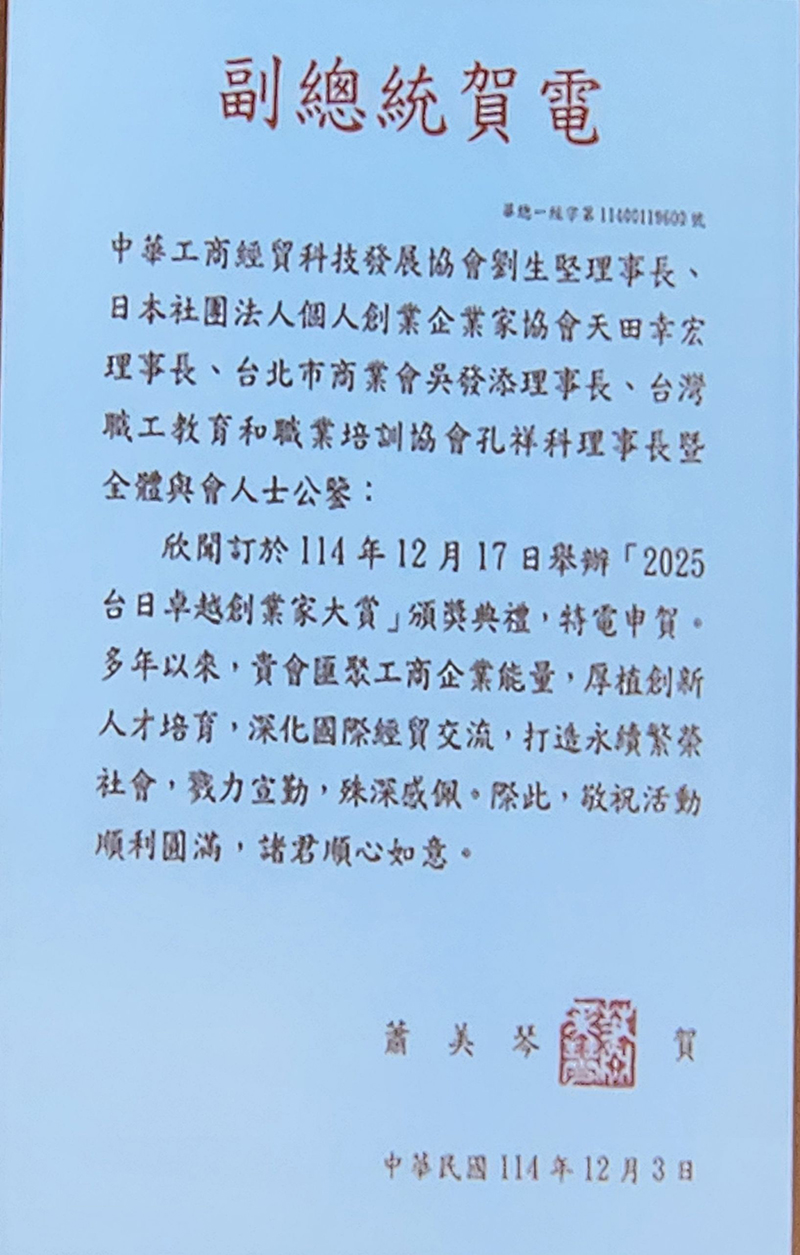中華工商經貿科技發展協會名譽理事長也是台北市議員的秦慧珠在大會開始提到:「今年是第三屆舉辦頒獎典禮及論壇,活動鼓勵更多年輕企業家創新創業,一共有五個獎項,分別是台日友好貢獻獎、中小企業組、新創企業組、創業導師組、微型創業組,恭喜所有獲獎的創業家,也感謝產發局的大力支援。活動讓中日友誼更綿長,也讓兩邊經濟發展更加蓬勃。」