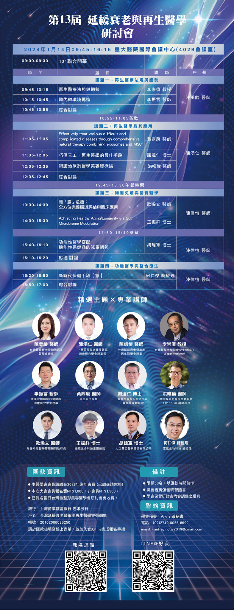 今年2024年第13屆「延緩衰老與再生醫學研討會」於1/14(日)於台大醫院國際會議中心舉辦,針對「再生醫療法規與趨勢」、「再生醫學及其運用」、「腸道免疫與營養醫學」及「功能醫學與整合療法」等四大議題,邀請醫學及產業界人士,進行深度而廣泛的討論,其中一堂討論”氫氣保健的相關課程,再度引起了熱烈的討論。