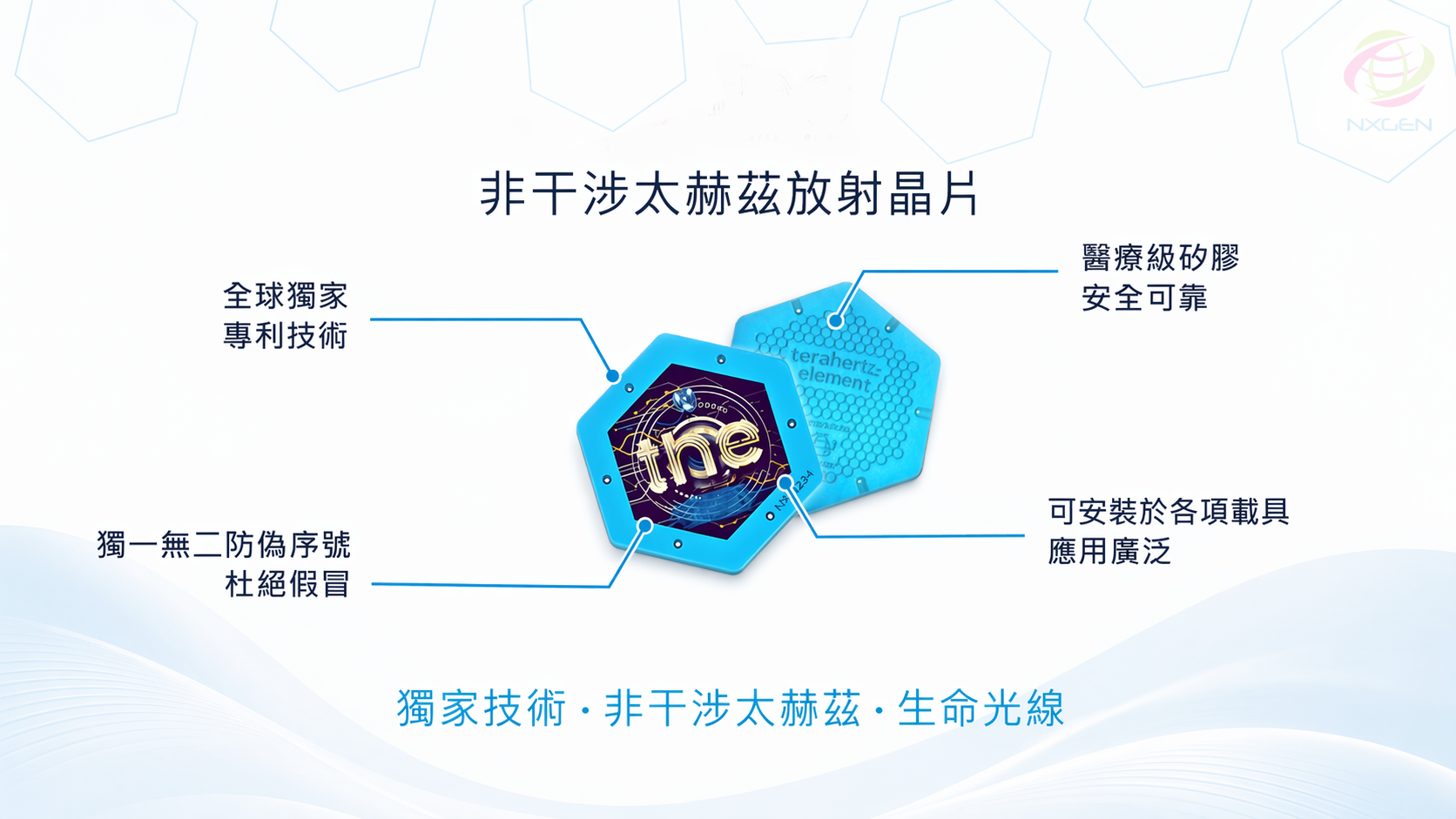 太赫茲頻率輸出模組:搭載單核心非干涉太赫茲晶片,可穩定輸出特定頻率範圍內之電磁波段。該晶片運作時無需外接能源激發,具備低功耗、穩定輸出等特性。